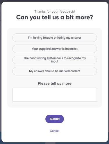 One of the advantages Mathspace has over print textbooks is that we can collect feedback about problematic questions and amend them, without the need to wait for the next edition of a textbook. This is how your students can report feedback.