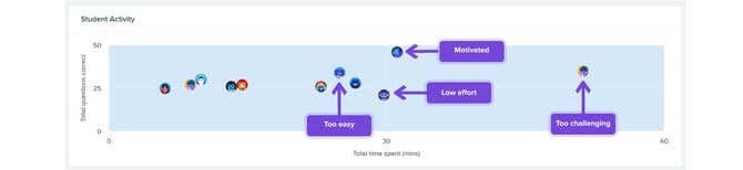 Bottom right: Students are spending a lot of time, but not getting many questions correct. They might need easier content to work on.