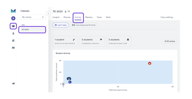 The Student Activity panel is separated into a grid. The further to the right students are, the more time they have spent on Mathspace. The further up, the more questions they have gotten correct.