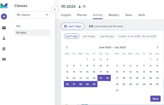 There are two time selection options. The first is to select from the past 7/14/30 days, or to customise a date range. This is helpful for regular monitoring and updates on your students' activity. The second is to select the Live mode - this will periodically refresh and is helpful for monitoring your class during a class period.