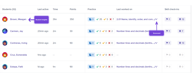 You can also see the breakdown of each students' questions answered, time spent, points, number of assigned and self- directed tasks completed, along with what each student has last worked on. Teachers will also see the number of skills check-ins completed and the number of skills collected. Clicking on a student's name will bring you to their Student Activity page. You can also view each student's Scorecard for their most recent work to see their exact working.