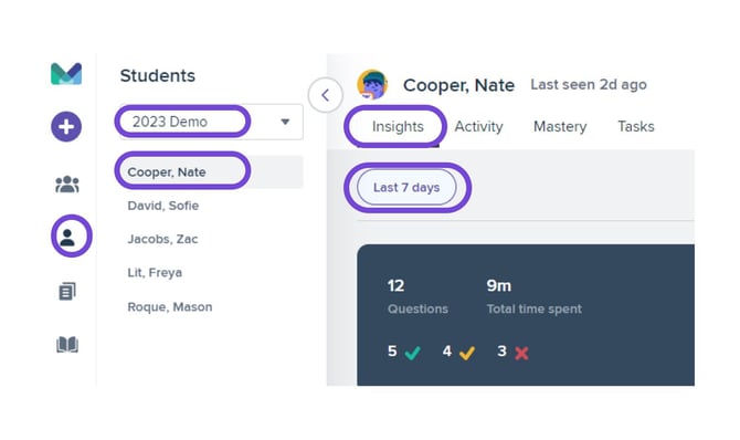You can access Student Insights by clicking on the "Students" button, selecting a student, and then clicking on "Insights". You can filter by class to more easily find your students, and change the date range to the past 7, 14 or 30 days.Student Insights consist of several panels of summary information, based on recent student work.