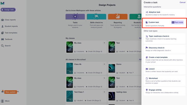 Set the test start time, then assign the test to your students. You can also convert any task template into a test by assigning it in ‘test mode’.