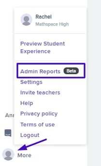 You can access the admin reports by clicking on More at the bottom of the teacher dashboard, then selecting Admin Reports.