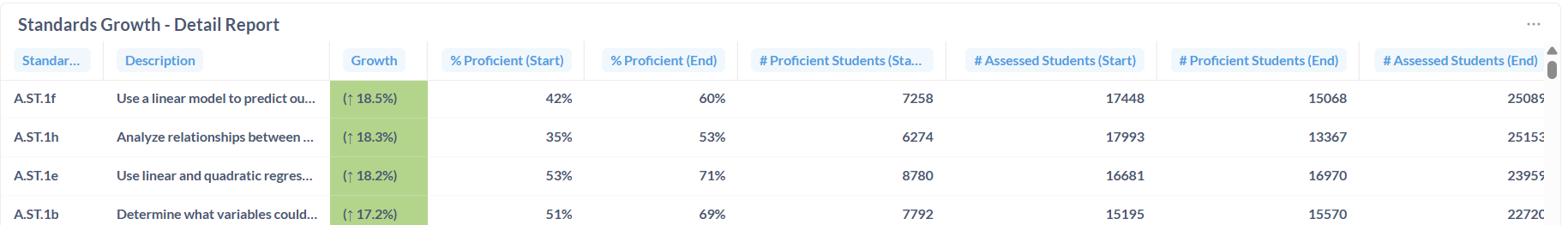 A detailed standards report is also available. It lists all standards with their descriptions, along with growth, the percentage proficient at the start and end of the period, and the raw numbers of proficient and assessed students. This allows you to monitor standards coverage and identify areas that may need attention.