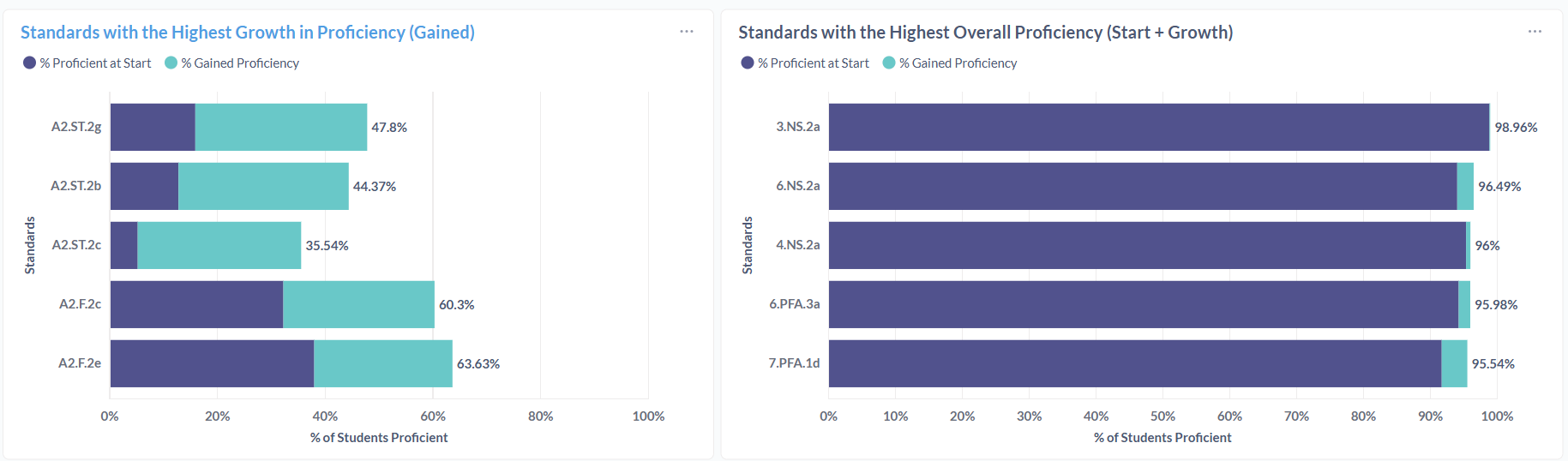 It includes bar charts showing the top standards with the most growth in student proficiency, and the top standards with the highest overall proficiency during the selected period. This helps you see where students are making gains and where they’ve reached strong levels of mastery.