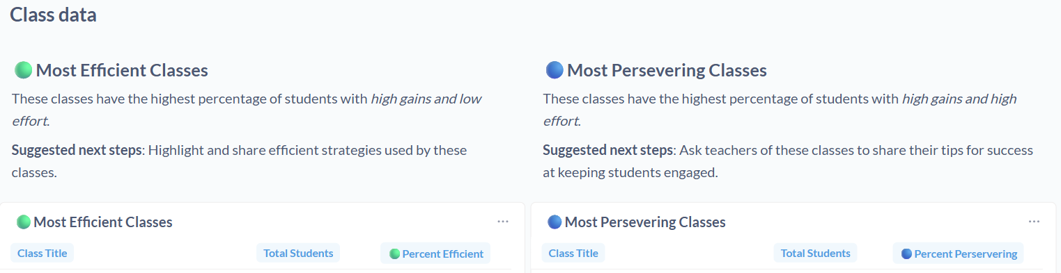 The section also provides class-level data, showing the top classes for each engagement category (those with the highest percentage of students in each group).This helps you identify classes with strong engagement as well as those that may need additional support with the suggested next steps for each category. Clicking on a class title takes you directly to its Class Report.