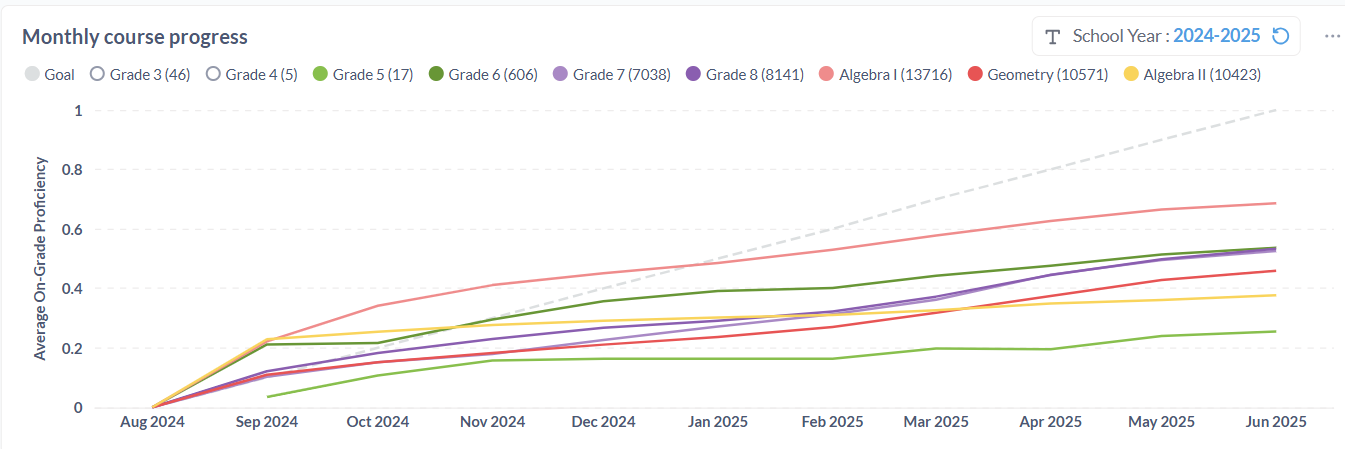 It includes the Monthly course progress chart, which shows how students’ proficiency at their enrolled grade builds over the school year. This helps you track whether students are making steady progress toward course completion.