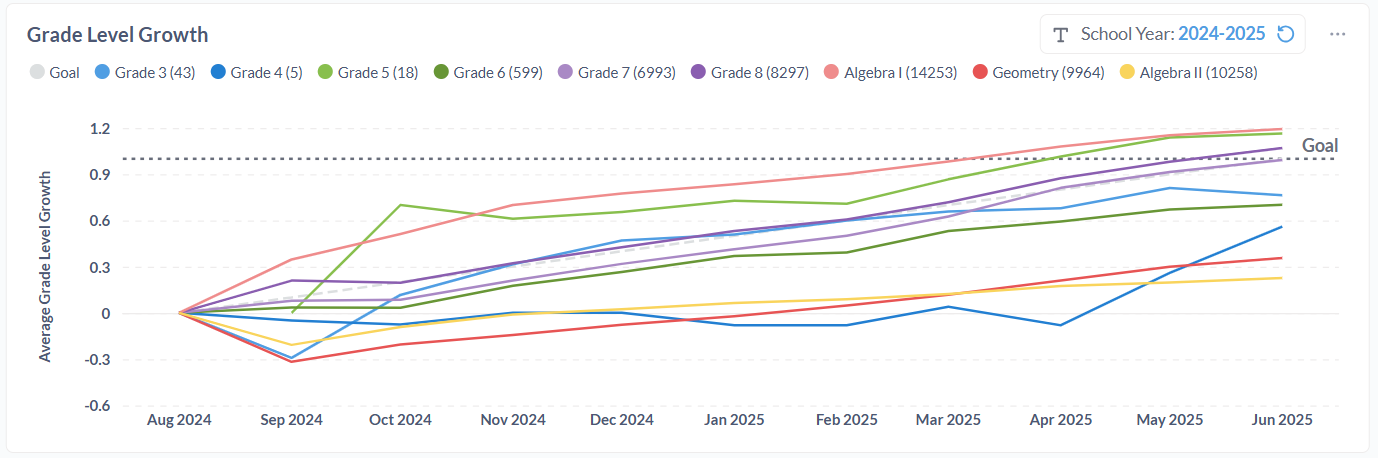 It includes the Grade Level Growth chart, which shows the average growth by enrolled grade over time. This helps you track whether students are making steady progress each month.