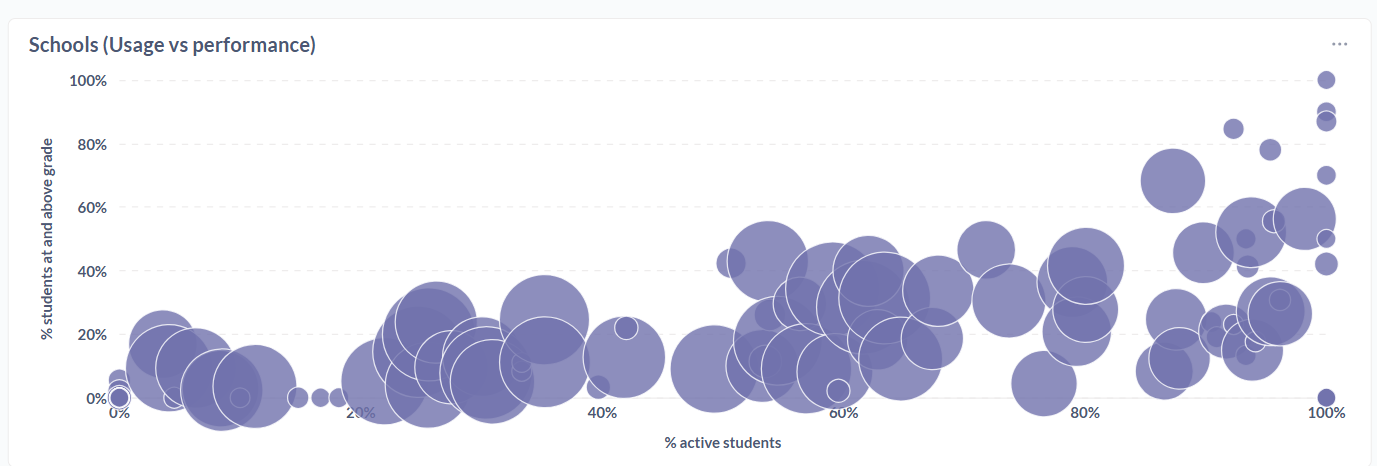 It includes the Usage vs. Performance chart, which plots each school’s percentage of students at or above their grade level (vertical axis) against their percentage of active students (horizontal axis). The size of the dot represents school population.