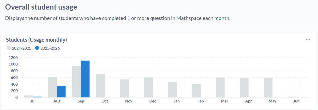 It includes the Students (usage monthly) chart, which shows how many students used Mathspace each month, with year-over-year comparisons. This helps you track usage trends over the past school year and see whether engagement is growing, steady, or declining.