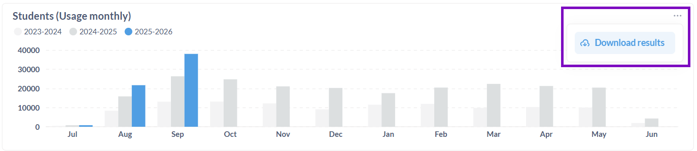 Note: You can download data from any chart in the reports by clicking the three dots icon in the top-right corner of the chart.