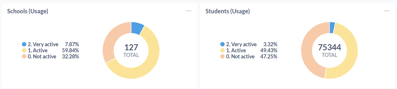 The School and Student summaries use these categories to show engagement. The school summary groups schools based on the majority activity level of their students, while the student summary shows the percentage of all students in each category.